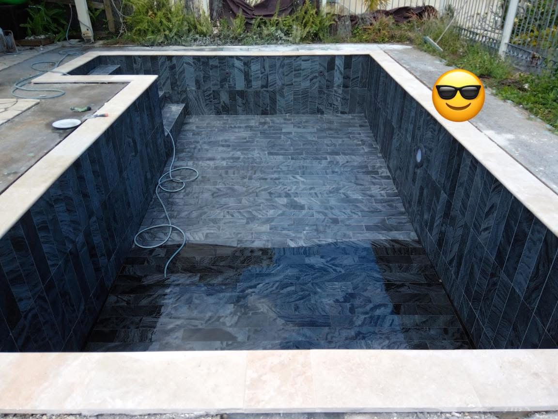 SUR CE PROJET SUR STE MARIE REPLACEMENT DES MARGELLES À +3CM DANS L'EAU AVEC RÉNOVATION COMPLÈTE EN PIERRE NATURELLE MATRIX DE CHEZ NATURE ENERGY AVEC DÉCOUPAGE SUR MESURE 15X30 POUR UN MAXIMUM DE REFLETS