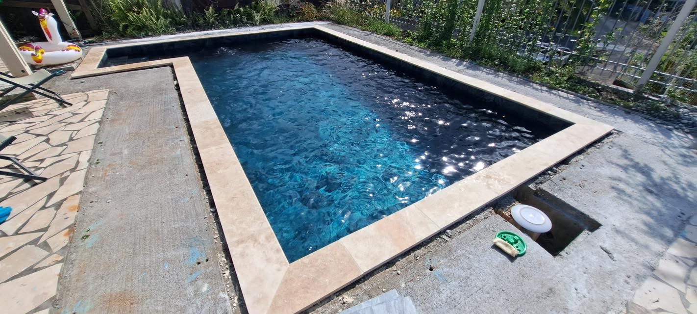 RÉALISATION D'UNE PLAGE DE PISCINE SUR SAINT ANDRÉ EN PIERRE NATURELLE TRAVERTIN GRIS, MISE EN PLACE DES MARGELLES, DU BÉTON ET DE LA POSE DE LA PIERRE