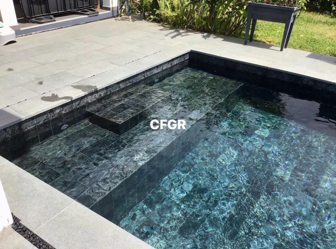 RÉNOVATION COMPLÈTE PISCINE INTERIEURE + PLAGE DE PISCINE EN PIERRE NATURELLE GRÈS GRIS OPUS DANS LES HAUTS DE SAINT FRANCOIS