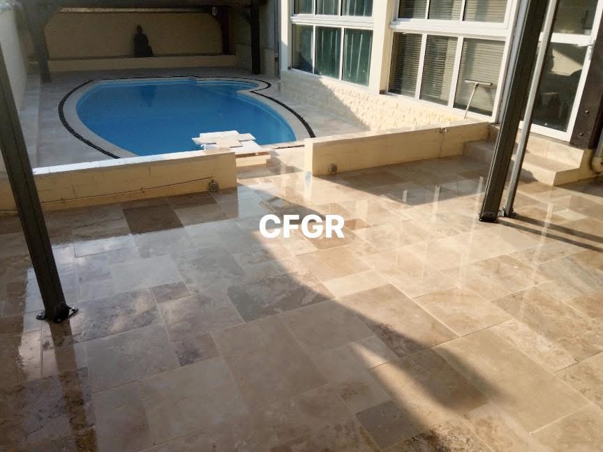 Réalisation d'une plage de piscine en travertin (pierre naturelle) opus beige ci dessous les différentes étapes