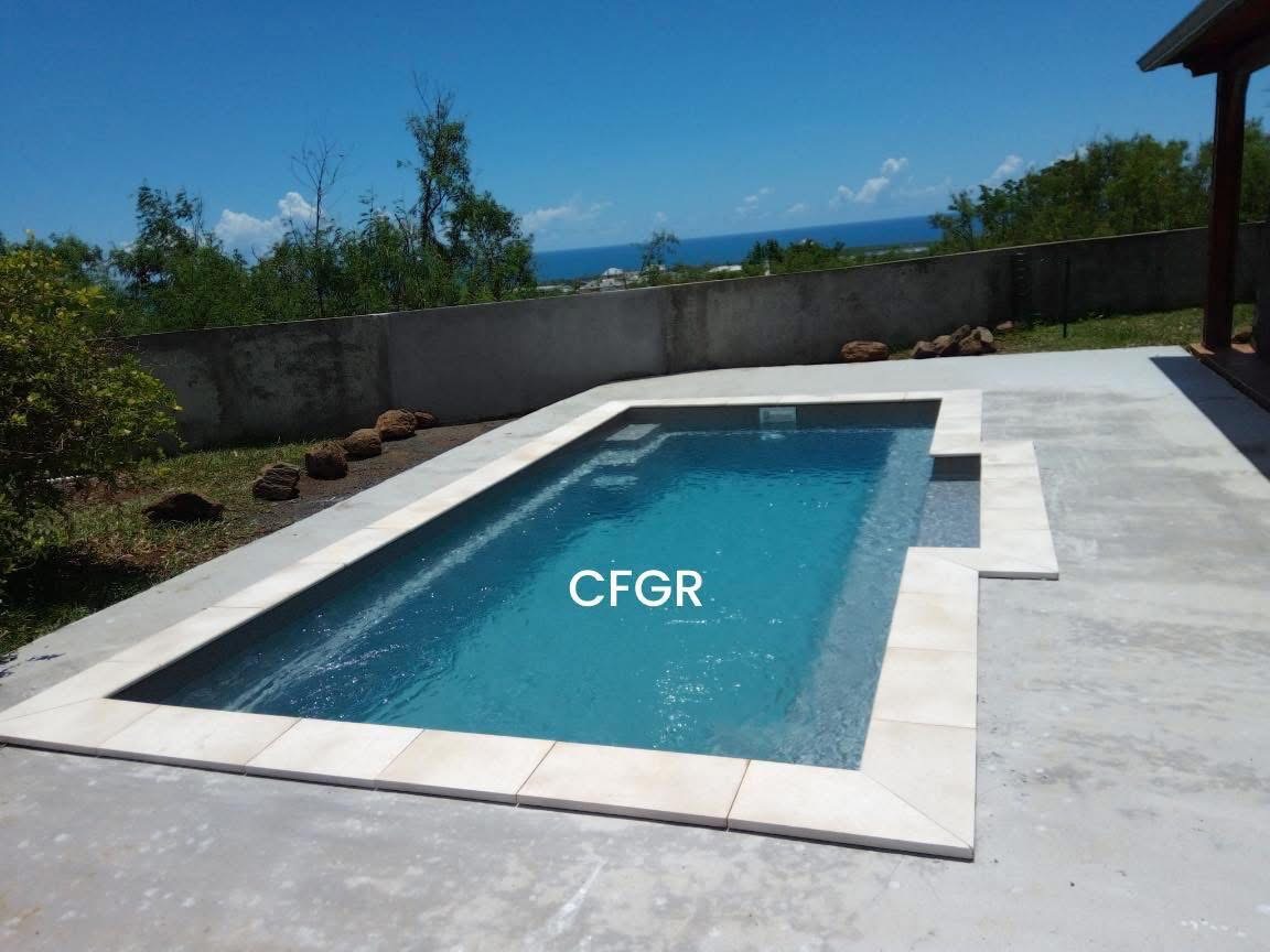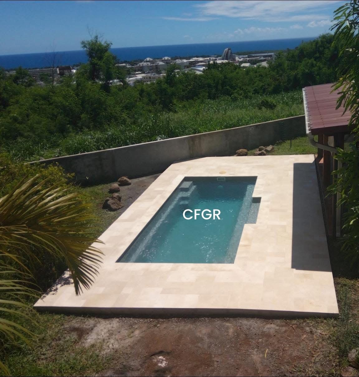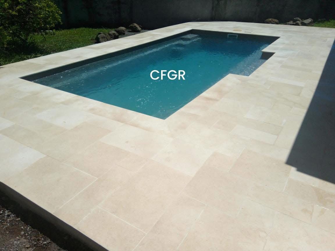 CREATION PLAGE DE PISCINE SUR SAINT BENOIT : MARGELLES TRAVERTIN BEIGE ET PLAGE EN TRAVERTIN GRIS OPUS