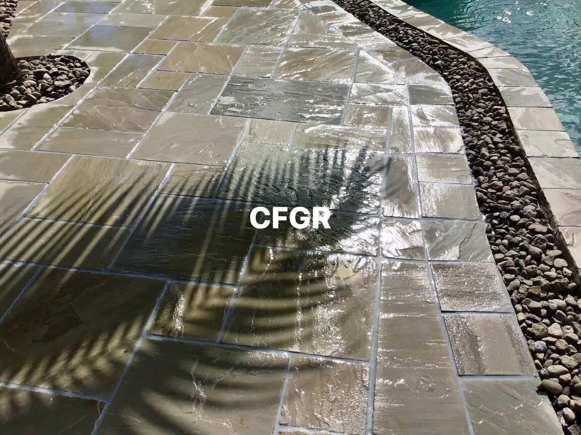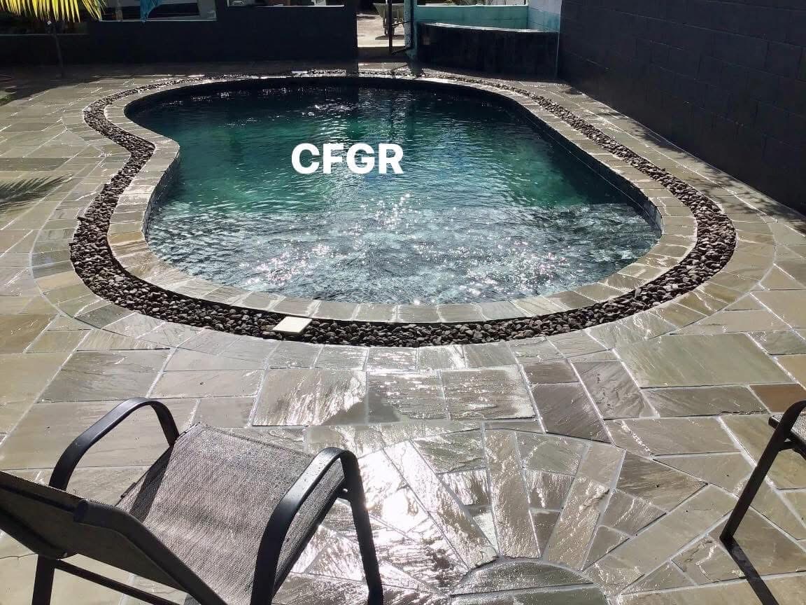 RENOVATION REVETEMENTS PISCINE EN BETON EN PIERRE NATURELLE AVEC FOND DE BASSIN CUVELÉ.